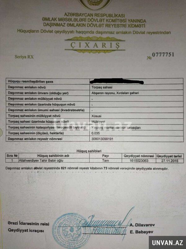 Əmlakın növü Torpaq sahəsi