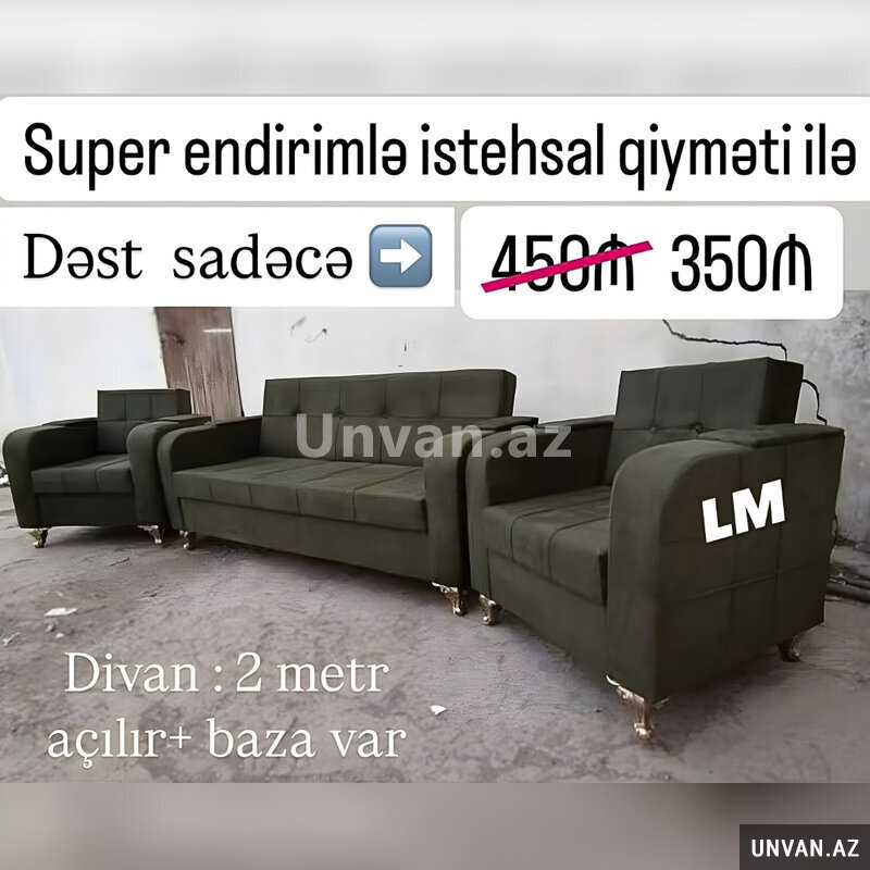 Divan + 2 kreslo Elan nömrəsi: 1134274 Elanın növü MebellərQiyməti 350 Azn Divan + 2 kreslo Endirim fürsəti 350₼ Yeni və sifarişlə Kitab kimi açılır+baza var+2 kreslo Rəng seçimi sərbəstdir Mebel Sifarisi (Bütün Elanları) Bakı şəhəri 0515858XXXnömrəni göstər Paylaş Paylaş Tarix: 27.01.2026 ViP elan et Elanı irəli çəkElana düzəliş etElanı sil