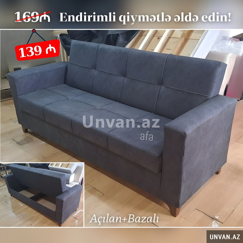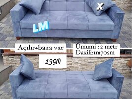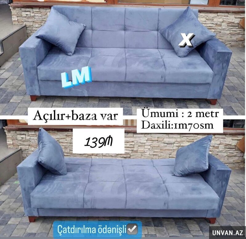 DİVAN Endirim fürsəti Sadəcə : 139₼ oldu Yeni və sifarişlə Ölçü : 2 metr (çöldən-çölə) İç ölçü : 1m70sm Kitab kimi açılır+baza var Rəng seçimi sərbəstdir 2 yastıq +15₼ Çatdırılma xidməti ödənişli