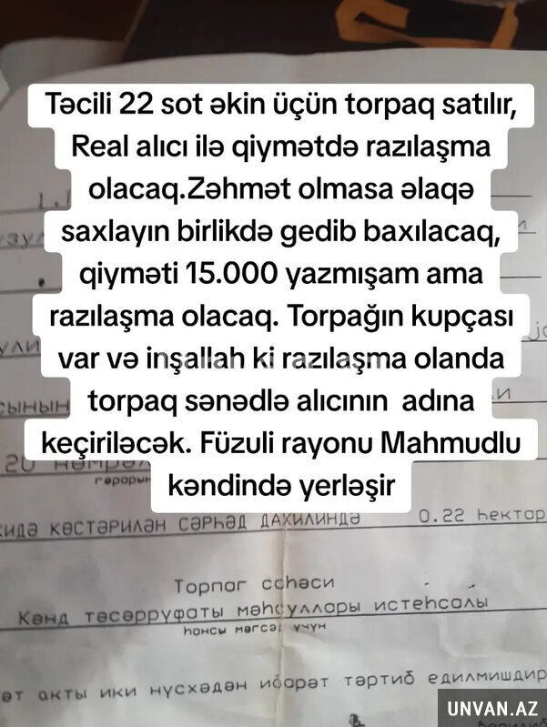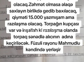 Real alıcı ilə qiymətdə razılaşma olacaq.Zəhmət olmasa əlaqə saxlayın birlikdə gedib baxılacaq, qiyməti 12.000 yazmışam ama razılaşma olacaq. Torpağın kupçası var və inşallah ki razılaşma olanda torpaq sənədlə alıcının adına keçiriləcək. Füzuli rayonu Mahmudlu kəndində yerləşir