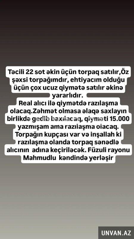 Real alıcı ilə qiymətdə razılaşma olacaq.Zəhmət olmasa əlaqə saxlayın birlikdə gedib baxılacaq, qiyməti 12.000 yazmışam ama razılaşma olacaq. Torpağın kupçası var və inşallah ki razılaşma olanda torpaq sənədlə alıcının adına keçiriləcək. Füzuli rayonu Mahmudlu kəndində yerləşir.
