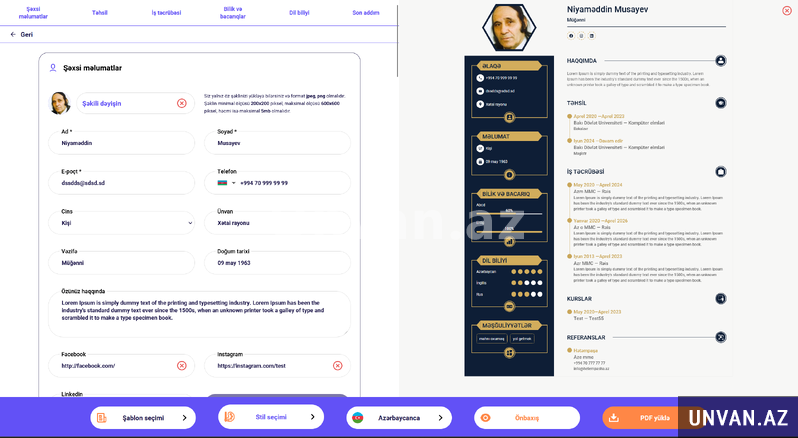 * Saytın dili fərqlidi, CV şablonlarının dilləri fərqli. (Yəni sayt Azərbaycanca ola ola İngilis və Rus dillərində CV yarada bilərsiniz)