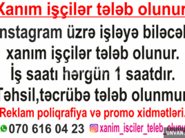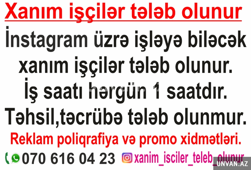 İnstagram üzərindən işləyə biləcək xanım 3 vakansiya üzrə xanım işçilər tələb olunur. işçilər tələb olunur. 1saat iş saatıdır gündə. Təhsil təcrübə tələb olunmur. Reklam poliqrafiya və promo xidmətləri