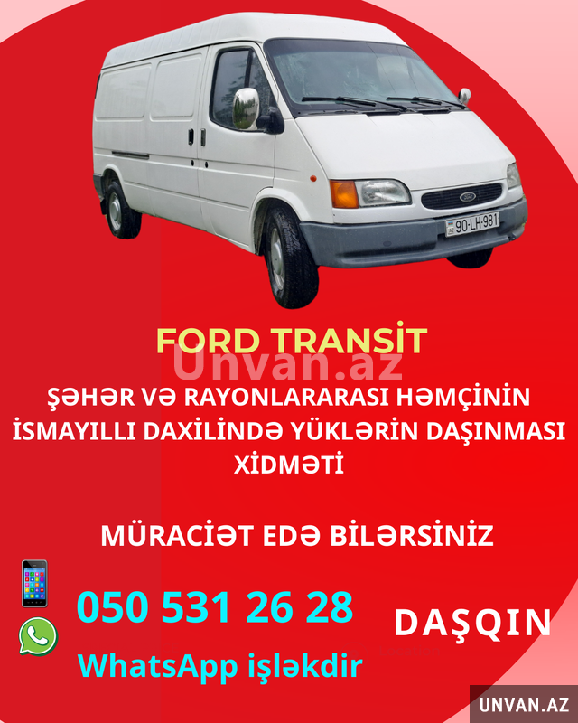 Şəhər və rayonlararası yükdaşıma xidməti göstərirəm, öz şəxsi avtomobilim ilə. Ford Transit - Uzunluq 3 metr, hündürlük 1.5 metr, en 1.7 metr.