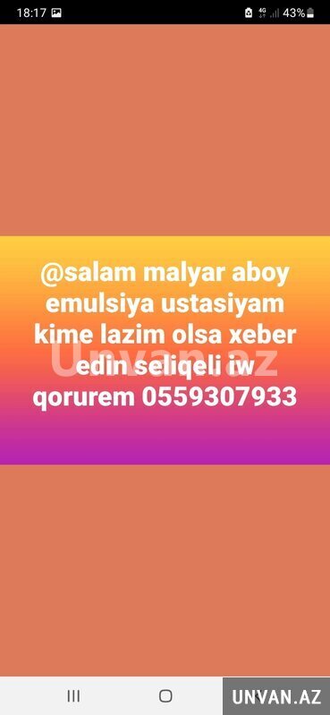 Salam deyerli muwteriler aboy emulsiya iwinde mukemel xudmet qosterirem buyurun elaqe saxliyin