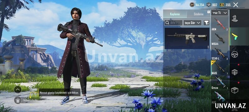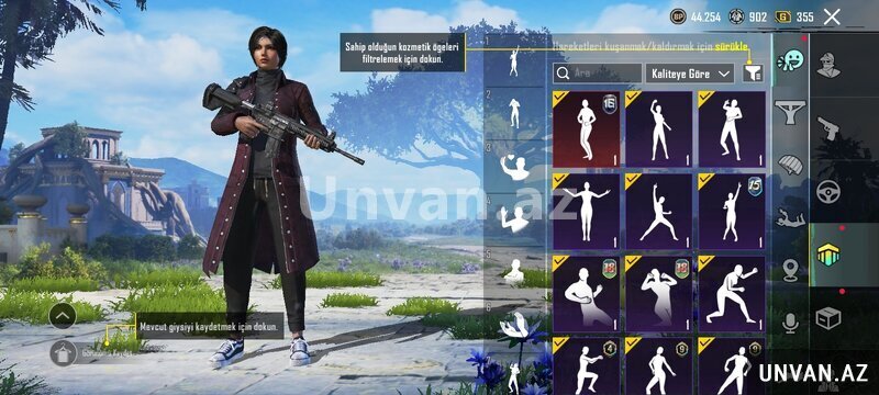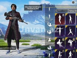 Hesabda çoxlu emote-lar mövcuddur, o cümlədən nadir və yüksək səviyyəli emote-lar (level 15–18 arası olanlar da var). Silah skinləri mövcuddur: M416, SCAR-L, AKM, AUG və digər silahlar üçün skinlər var. Hesabda UC və BP balansı mövcuddur, hazır vəziyyətdədir.