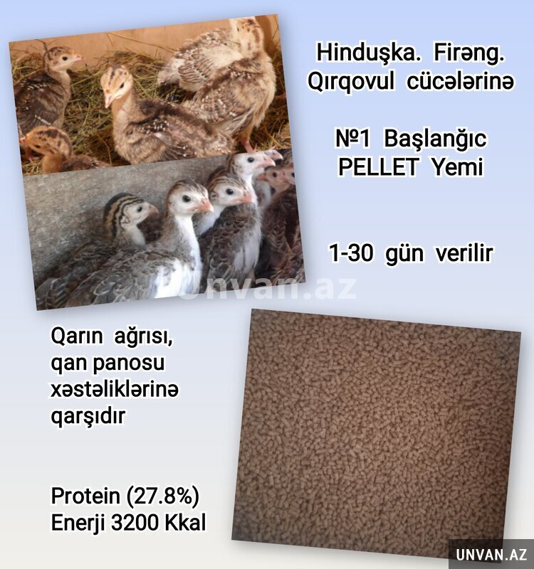 Hinduşka. Firəng. Qırqovul cücələrinə №1 Başlanğıc PELLET Yemi. 1-30 gün verilir. Qarın ağrısı, qan panosu xəstəliklərinə qarşıdır. Əzələ və sümük inkişafı üçün bütün vitamin, mineral və amin turşuları, yağlı toxumlar və jmıxı, taxıl məhsulları, nişasta, kalsium, dikalsium fosfat, duz, enzimlər, kiflənmə əleyhinə antioksidantlardan hazırlanır. Təbiətin seçkin quşlarını sağlam və güclü böyütmək istəyirsinizsə, başlanğıcı düzgün qoyun! Protein (27.8%). Enerji 3200 Kkal. Çatdırılma PULSUZ Kisə ilə 50 kq = 65 ₼