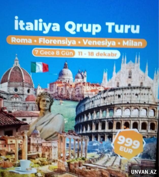 İtaliya qrup turu təşkili 7 gecə. 8 gün. 11-18dekabr. Turun qiyməti 999usd dollar
