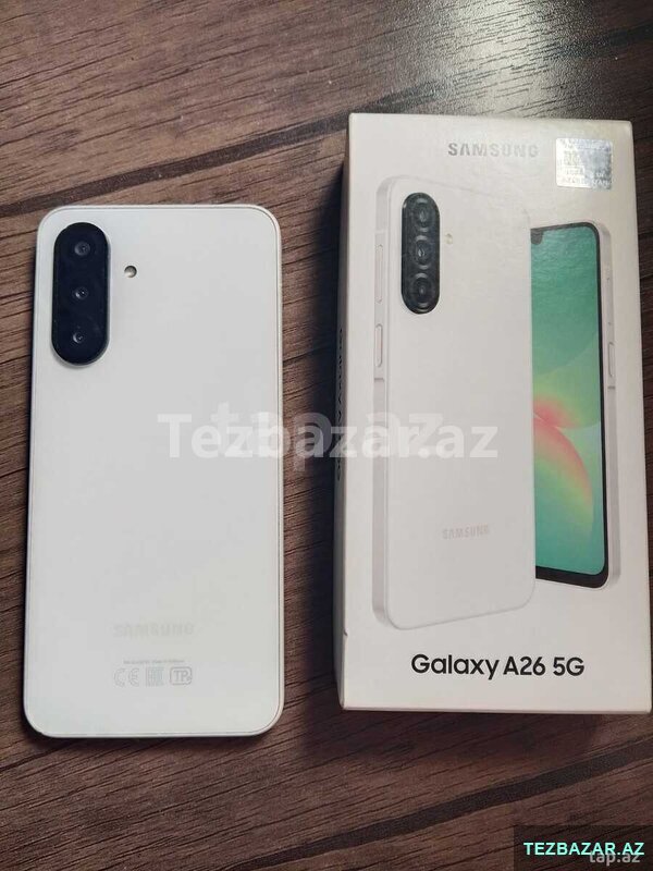Samsung galaxy A26 5G. Ağ rəngdədir. Karobkası və zaryatka şunuru var