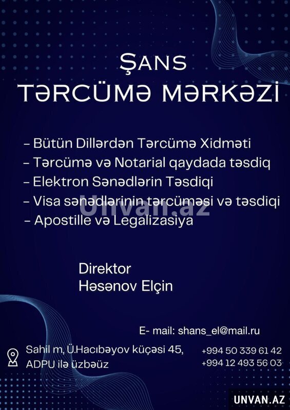 "Şans" tərcümə mərkəzi ingilis, rus, polyak, alman, çin, türk, ivrit, itlayan və s. dillərə sənədlərin tərcümə və təsdiqini həyata keçirilir. Xidmət münasib qiymətlərlə, tez və keyfiyyətlə təqdim olunur.