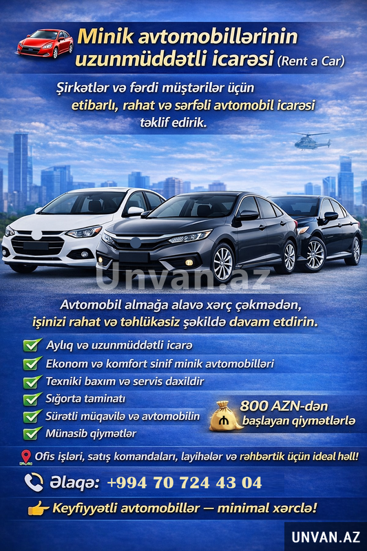 Təşkilatlar üçün minik avtomobillərinin aylıq icarəsi