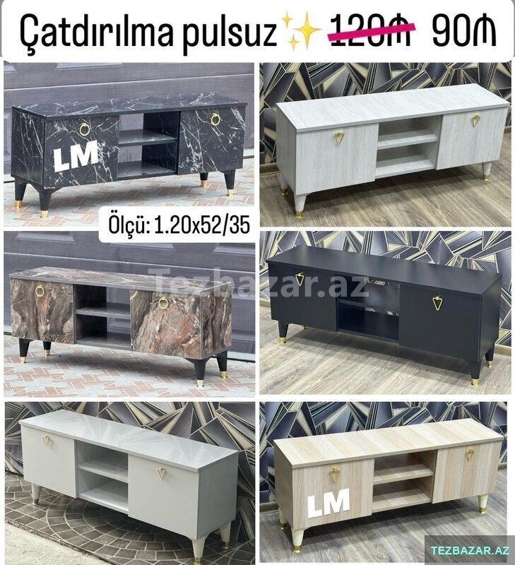 _*TV STEND / TV altı*_ Yeni və sifarişlə. Qiymət : *90₼* __________________ Ölçü : en1.20xhün52xdər35 ____________________ Rəng seçimi sərbəst. *Çatdırılma və quraşdırılma Bakı daxili pulsuz
