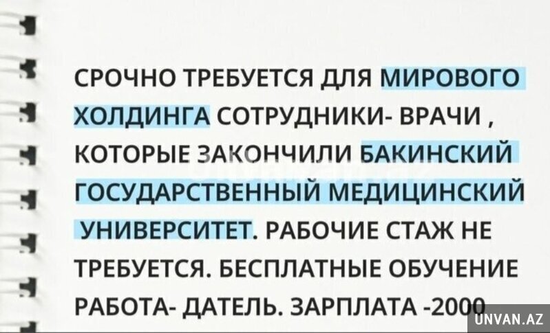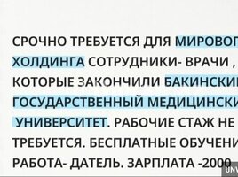 Срочно требуется для мирового холдинга сотрудники-врачи, которые закончили бакинский государственный медицинский университет. рабочий стаж не требуется. бесплатное обучение. работа — датель. зарплата — 2000.