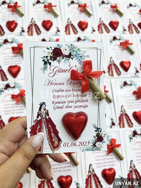 Istenilen formada xina sokolad xoncalari sifarisle hazirlanir.Sifarisinizi en az bir nece gun onceden yazdirin.Sifaris ucun whatsap ve ya zeng.
