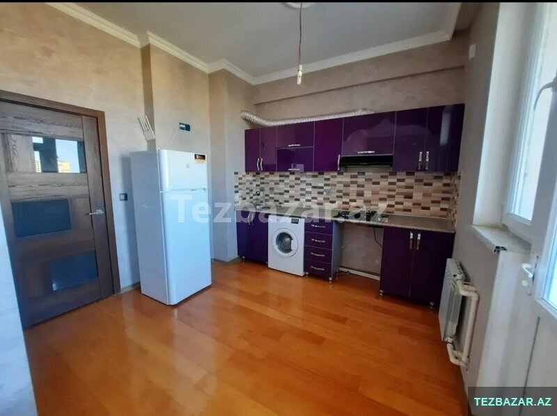 - Mətbəx: Daxili şkaflar (parlaq bənövşəyi fasad), mərmər tipli stolüstü, aspirator, qaz plitəsi, soyuducu, paltaryuyan maşın, naxışlı kafel arakəsmə. Pəncərəli və genişdir.