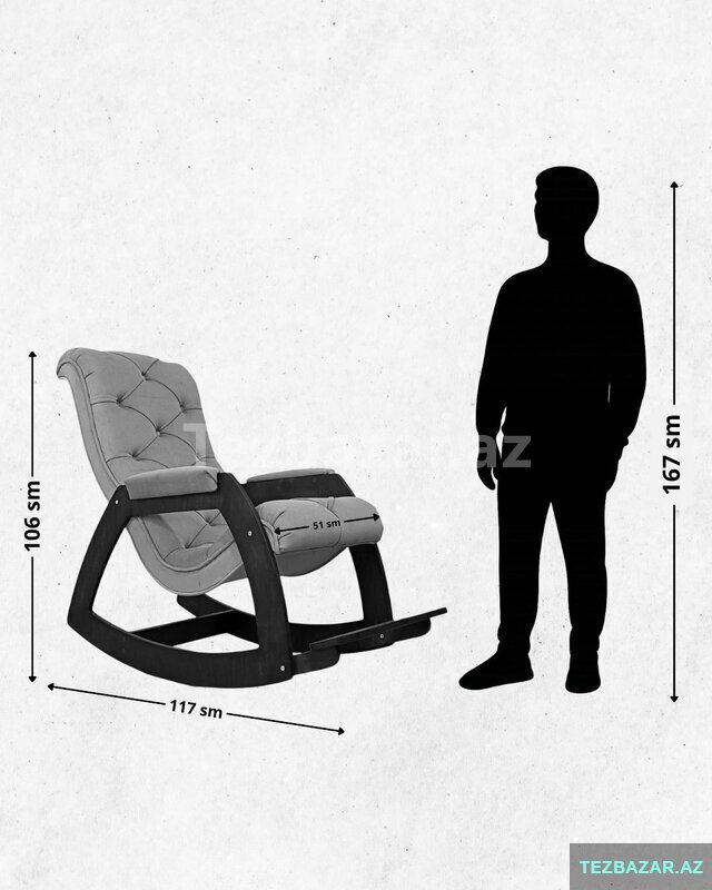 Ölçüləri: Hündürlüyü: 106sm, eni: 65sm, dərinlik: 135sm, Oturacağın ölçüləri: 51.5*50sm